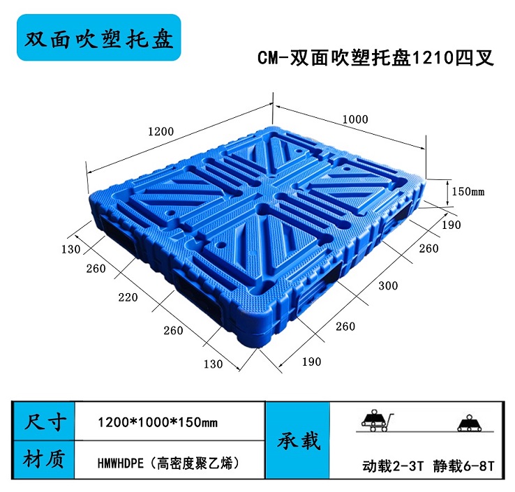 產品描述:1210四叉雙面吹塑托盤,吹塑托盤1.2*1米,叉車塑料托盤1210